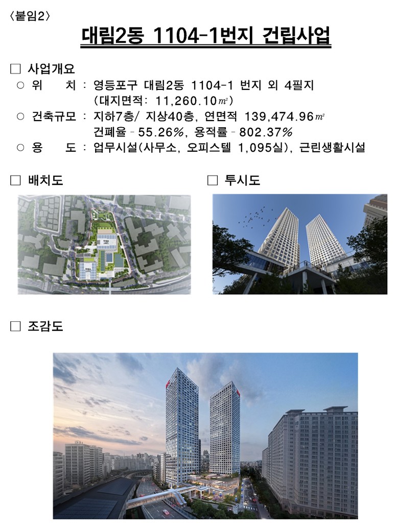 구로디지털단지역 인접 영등포구 대림2동 1104-1번지 일대에 업무시설과 오피스텔 1,095실 등이 공급되며 공원과 방수설비 시설도 확충돼 안전하고 편리한 복합시설이 들어선다.