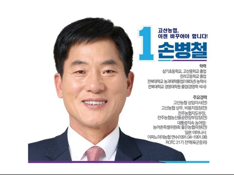 손병철 당선인은 1959년생으로 전라북도 완주군 고산면 양화로에 태어나 전북대학교 경영 대학원(경영약 석사)과정을 밟고 (전)고산농협 상임이사와 (전)대통령 직속 농어촌 특별위원회 좋은농협 위원으로 지낸 이력이 있다.