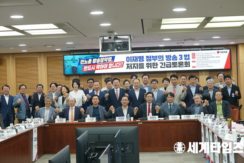 국민의힘 '송언석' 비상대책위원장 겸 원내대표가 21일 서울 여의도 국회 의원회관에서 열린 '이재명' 정부의 방송 3법 저지를 위한 긴급토론회'에서 참석자들과 기념촬영 하고 있다.