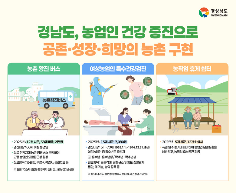 경상남도(도지사 박완수)는 고령 농업인과 농촌 취약지역에 거주하는 주민들의 의료접근성을 높이고, 농작업으로 인해 생기는 질환을 예방하기 위해 농업인 건강증진 3개 사업에 올해 31억 원을 투입한다고 밝혔다.