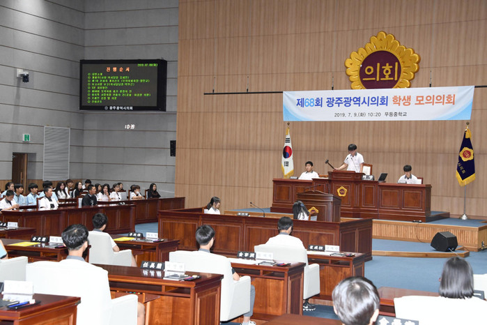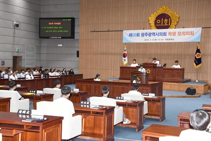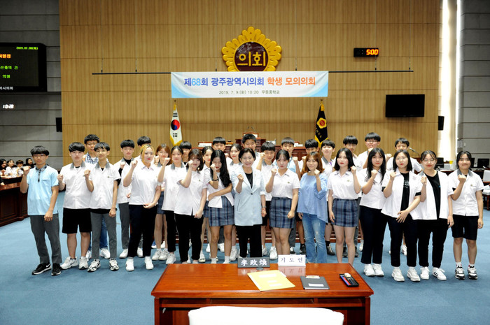 [광주=세계타임즈 손권일 기자] 광주광역시의회(의장 김동찬)는 7월 9일 10시 20분에 시의회 본회의장에서 무등중학교 학생들을 대상으로 ‘광주광역시의회 제68회 학생 모의의회’를 개최했다.