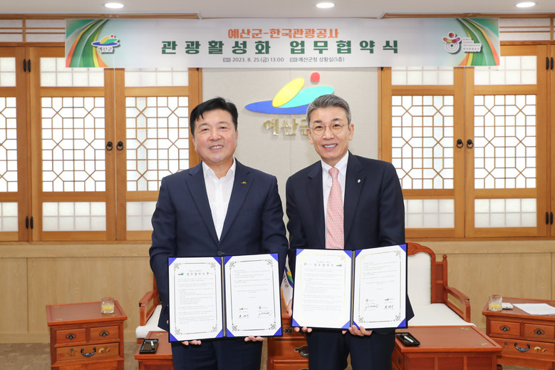 [세계타임즈 = 이현진 기자] 한국관광공사(이하 공사)와 예산군은 8월 25일 예산군청에서 지역관광 콘텐츠 개발 및 홍보를 위한 업무협약을 체결했다.