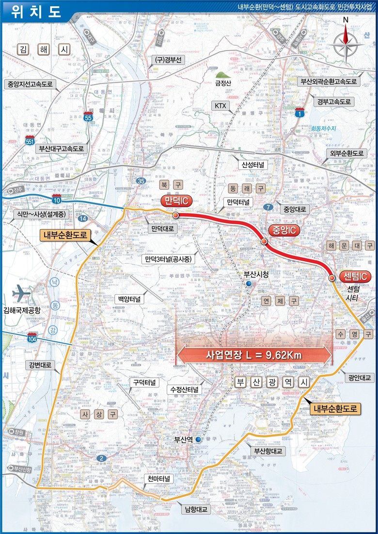* 부산광역시 내부순환도로망 : 66호광장(신평동)~덕천나들목(IC)~만덕센텀~광안대교~부산항대교~영도연결고가도로~남항대교~천마산터널~장평지하차도~66호광장(신평동)