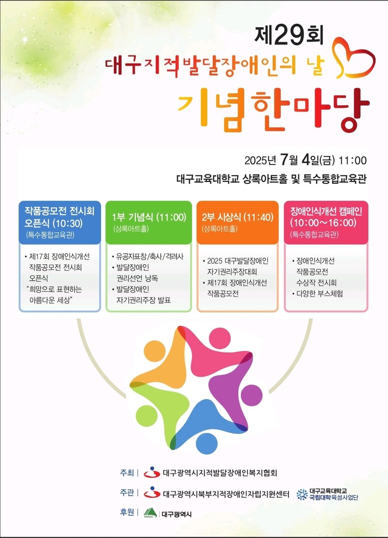▸ 유공자 표창, 장애인식개선대회 시상식 및 작품전시회, 각종 체험부스 운영 [세계타임즈=대구 한윤석 기자] 대구광역시와 ㈔대구광역시지적발달장애인복지협회는 7월 4일(금) 대구교육대학교 상록아트홀에서 ‘제29회 지적발달장애인의 날 기념한마당’ 행사를 개최한다.
