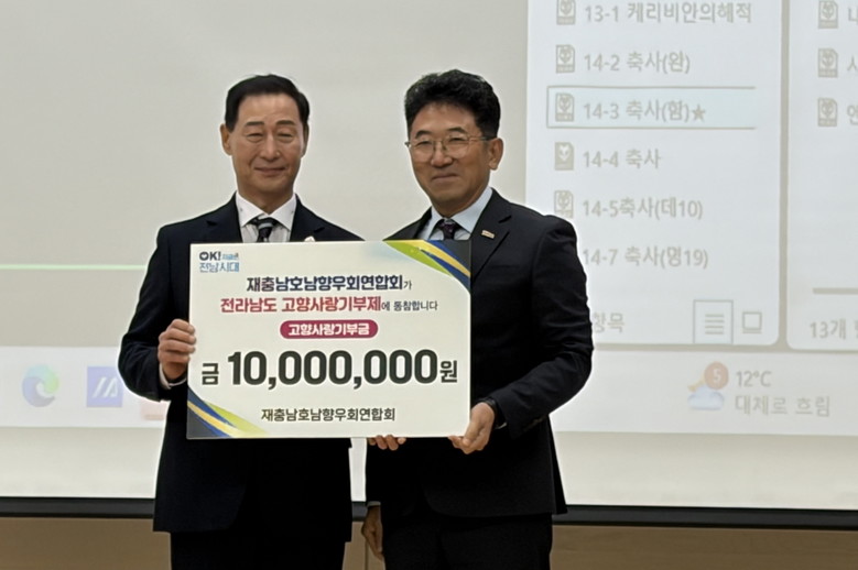 특히 충남호남향우회에서는 정치균 부회장 300만 원, 김용석 사업국장 300만 원, 문상식 자문위원 300만 원 등 총 1천만 원의 고향사랑기부금을 전남도에 기탁해 몸소 고향사랑을 실천, ‘전남 고향사랑기부제 명예의 전당’에 헌액되는 영예를 안았다.