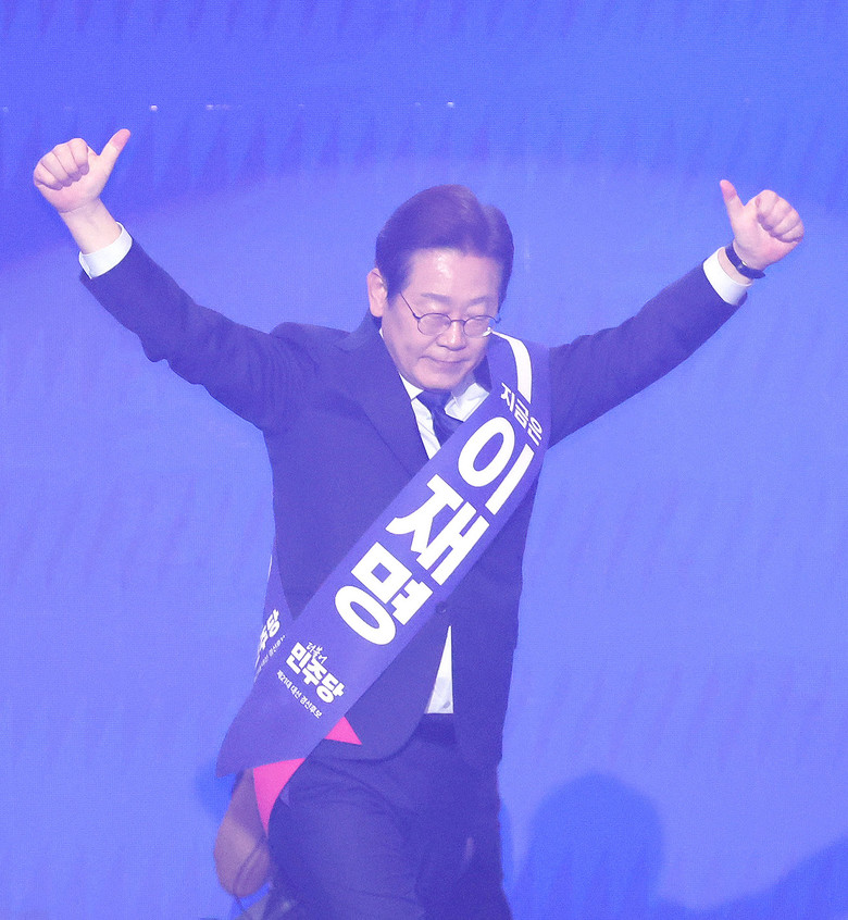 [세계타임즈 = 심귀영 기자] 더불어민주당 이재명 대선 경선 후보가 27일 경기 고양시 킨텍스에서 열린 '제21대 대통령선거 후보자 선출을 위한 수도권·강원·제주 경선 및 최종 후보자 선출 대회'에서 정견 발표를 하기 위해 단상으로 이동하며 손들고 있다. 2025.4.27