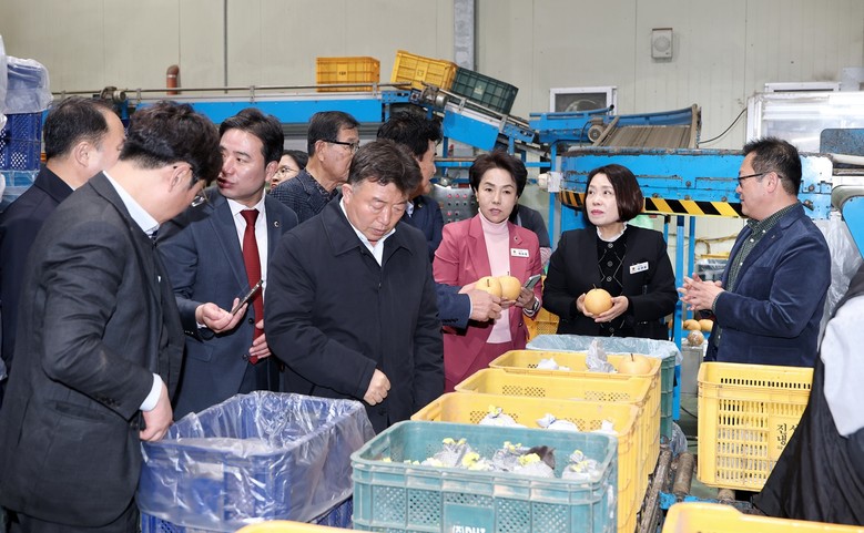 이후 농수해위는 아산원예농협 과수거점산지유통센터(APC)를 찾아 배·사과 등 지역 주력 과수의 집하·선별·저장·출하 전 과정 운영 체계를 점검했다. 아산유통센터는 2012년 개장 이후 대형 유통업체, 도매시장, 미국‧대만 수출 등으로 연간 약 1만 9,600톤의 과수를 취급하는 지역 핵심 유통시설로, 참여 농가의 안정적 판로 확보와 지역 과수산업 경쟁력 강화에 중요한 역할을 하고 있다. 농수해위는 현장에서 ▲선별시설 효율성 ▲저온저장고 운영 수준 ▲상품화 설비 확충 필요성 등 시설 운영 전반을 세밀히 점검했다.