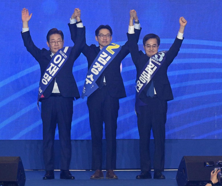 [고양 세계타임즈 = 심귀영 기자] 더불어민주당 이재명(왼쪽부터)·김경수·김동연 대선 경선 후보가 27일 경기 고양시 킨텍스에서 열린 '제21대 대통령선거 후보자 선출을 위한 수도권·강원·제주 경선 및 최종 후보자 선출 대회'에서 기념 촬영하고 있다. 2025.4.27 [공동취재]