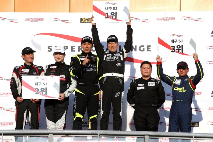 [사진설명] 2019 슈퍼챌린지 3라운드, 내구레이스 S-1 클래스에서 우승한 이진기(오른쪽 세번째) 드라이버가 시상대 꼭대기에 올라 기뻐하고 있다.
