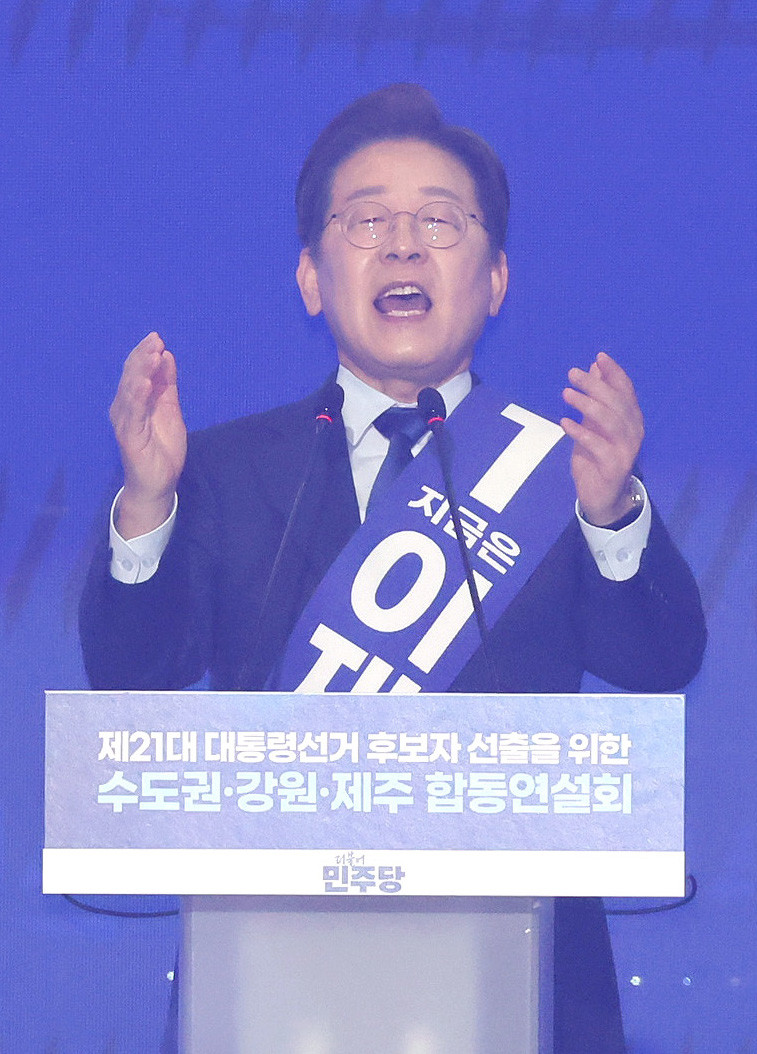[고양 세계타임즈 = 심귀영 기자] 더불어민주당 이재명 대선 경선 후보가 27일 경기 고양시 킨텍스에서 열린 '제21대 대통령선거 후보자 선출을 위한 수도권·강원·제주 경선 및 최종 후보자 선출 대회'에서 정견 발표를 하고 있다. 2025.4.27