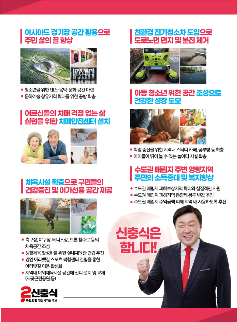신 후보의 검암 지역 맞춤형 공약은 ▲서울 지하철 9호선 검암역 정차 추진 ▲검암 인천 복합환승센터 환승을 위한 KTX 검암역 재 출발 ▲육교 설치를 통한 검암 주민들의 아라뱃길 이용 편의 확충 ▲검암 2지구~계양 연결도로, 꽃뫼길 실행 촉구 등이다.