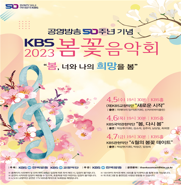 [세계타임즈 = 백진욱 기자] KBS한국방송이 공영 방송 50주년을 맞이해 KBS와 KBS교향악단 공동 주최로 ‘2023 KBS봄꽃음악회’를 개최한다. 이번 행사는 2018년 개최 이후 코로나19로 중단됐다가 3년 만에 개최되는 행사로 올해로 3회째를 맞이한다.