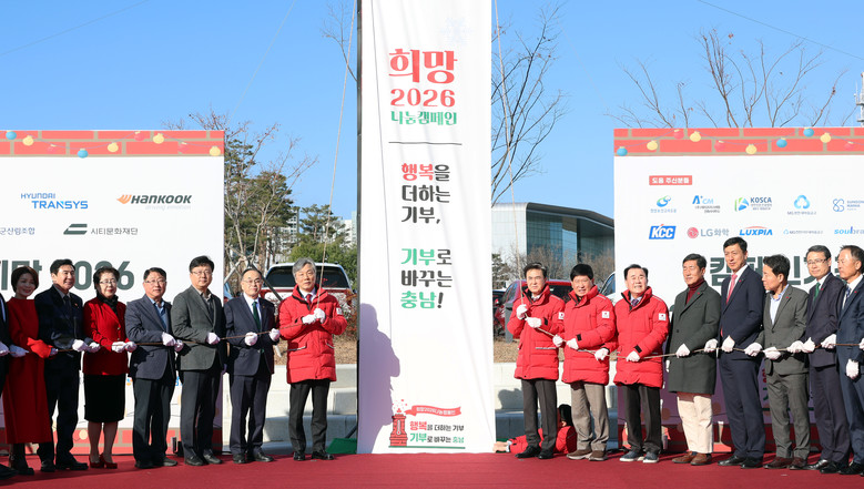 도는 1일 도청 남문 다목적광장에서 김태흠 지사와 성우종 충남사회복지공동모금회장, 사회복지 관계자 등 200여 명이 참석한 가운데, ‘희망2026나눔캠페인’ 사랑의 온도탑 제막식을 개최했다.
