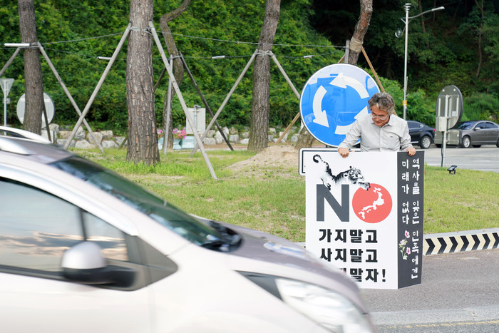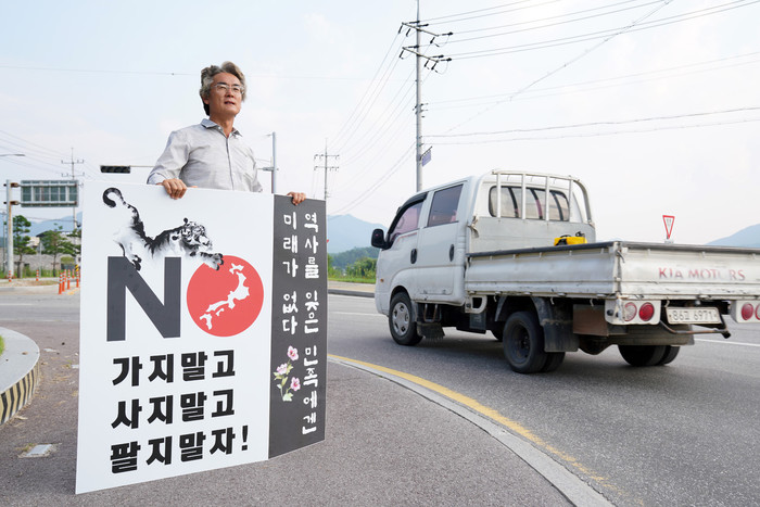 [양구군=세계타임즈 김민석 기자] 신철우 양구군의원이 폭염이 절정에 달하는 6일 송청리 회전교차로에서 일본제품 불매운동 1인 시위를 했다.