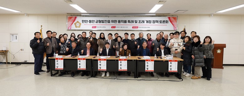 [안양시 세계타임즈=송민수 기자] 안양시의회 김경숙 의원(국민의힘, 석수1·2동·충훈동)은 12월 24일 시의회 소회의실에서 「만안·동안 균형발전을 위한 용적률 특례 및 조례 개정 정책토론회」를 개최하고, 만안과 동안 간 개발 격차 해소를 위한 다양한 정책 대안을 논의했다.
