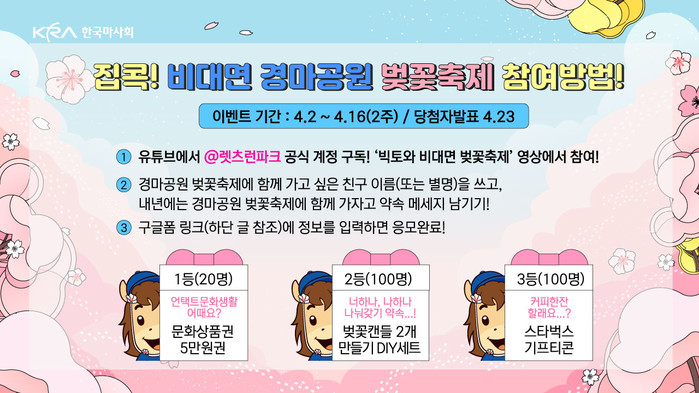 이벤트에 참가하려면 한국마사회 ‘렛츠런파크’ 유튜브 채널을 구독하고 비대면 벚꽃축제 콘텐츠에 코로나19 이후 경마공원 벚꽃축제에 함께 가고 싶은 친구에게 약속의 메시지를 쓰면 응모가 완료된다.