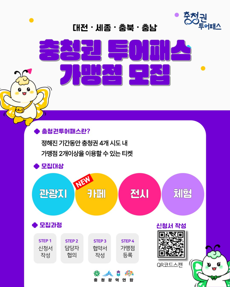 한편, 충청광역연합은 충청권투어패스의 상품 경쟁력 강화를 위해 관광지나 체험시설 뿐 아니라 식음료 업종(카페 등)까지 신규 가맹점 모집을 확대하고 있다. 가맹점으로 등록하면 투어패스 공식 채널 홍보와 주요 온라인 판매망 연계 등 다양한 혜택을 누릴 수 있어 관광객 유입 효과가 기대된다.