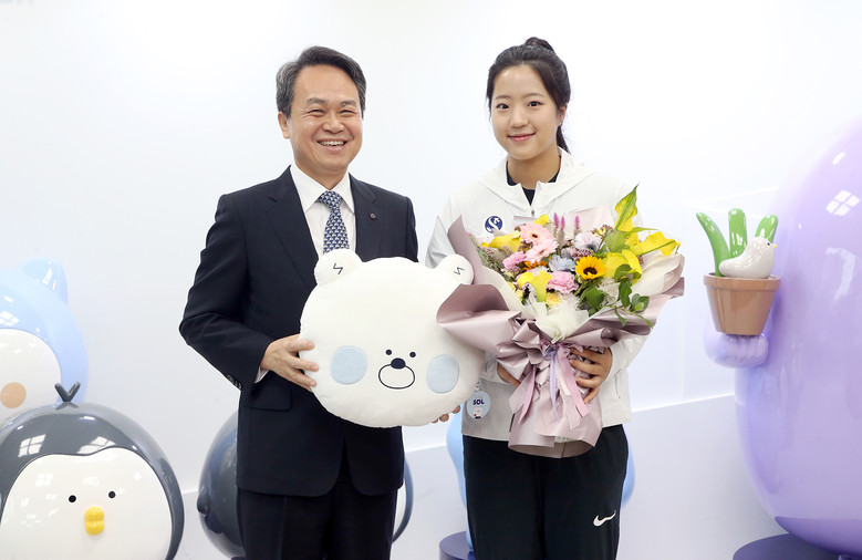 이날 행사에서 신한금융 진옥동 회장은 신유빈 선수를 격려하며 포상금과 꽃다발을 전달했으며, 신유빈 선수는 본인이 획득한 금메달을 진 회장에게 걸어주는 등 그간의 지원에 대한 감사를 전했다.