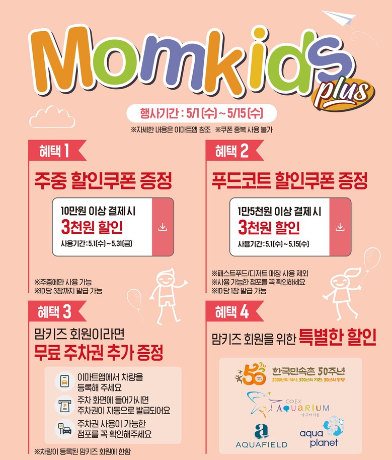 이 밖에도 이마트 주중 쇼핑 쿠폰, 푸드코트 할인쿠폰, 무료주차권 추가 증정 등의 혜택을 더했다.