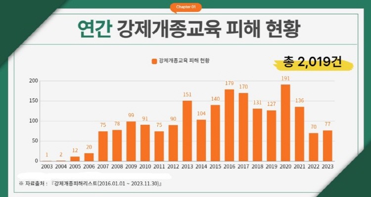 강제개종피해인권연대(이하 강피연‧대표 김현명)에 따르면 지난해 신천지예수교회 교인들을 대상으로 한 강제개종 사건은 77건에 이르며 2003년부터 2023년 2019건이 발생했다고 밝혔다. 매년 평균 약 96건이 발생한 것으로, 주로 여성과 청년을 대상으로 이뤄진다. 종교를 바꾸도록 강요하는 과정에서 납치, 감금, 폭행 등 불법행위에 노출된다.