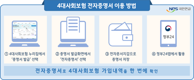 [세계타임즈 = 이영진 기자] 국민연금공단(이사장 김태현)은 국민 편의를 위해 4대사회보험 전자증명서 발급 서비스를 개시하였다고 12일 밝혔다.