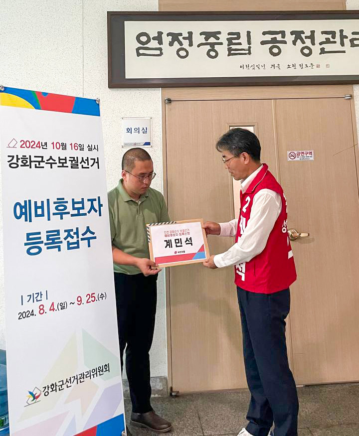 [세계타임즈 = 심귀영 기자] 국민의힘 계민석 후보가 제79주년 광복절을 하루 앞둔 8월 14일, 강화군수 보궐선거 예비후보 등록을 하면서 오는 10월 16일 실시되는 인천 강화군수 보궐선거의 국민의힘 후보 자리를 놓고 후보들간의 본격적인 공천경쟁이 시작됐다.