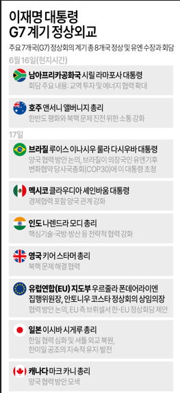 이 대통령은 이번 일정 가운데서 하이라이트로 꼽히는 한일 정상회담을 진행하고, 이시바 총리와 한일 협력 심화 및 셔틀 외교 복원, 한미일 공조의 지속적 유지·발전에 뜻을 모았다.트럼프 대통령과의 회담 불발로 이 대통령의 G7 방문의 의미가 다소 퇴색되는 것 아니냐는 우려가 나왔으나, 국교 정상화 60주년을 맞아 양국이 서로의 국익 발전에 손잡고 관계 개선에 나서기로 한 점은 성과로 꼽을 만하다는 평가가 나온다.이 대통령은 이번 G7 정상회의 주최 국인 캐나다의 마크 카니 총리와 정상회담을 하며 양국 협력 방안을 모색한 것으로 공식 일정을 모두 마쳤다.이 대통령은 에마뉘엘 마크롱 프랑스 대통령을 비롯해 정상회담을 하지 못한 국가 정상과도 일정 중간 가벼운 인사와 대화를 나눴다고 대통령실이 전했다.