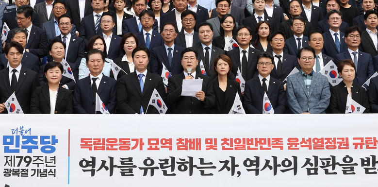 더불어민주당 박찬대 대표 직무대행 겸 원내대표와 의원들이 제79주년 광복절인 15일 오전 서울 효창공원 내 임정요인·삼의사·백범 김구 선생 묘역을 참배한 뒤 백범김구기념관 앞에서 규탄 성명을 발표하고 있다.