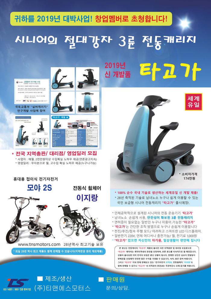 (주)티앤에스모터스는 28년간 전동자전거를 생산한 업체로 나름의 기술력을 국내외적으로 인정받고 있는 회사다. 또 지난 3년간 국가 연구개발 프로젝트인 실버세대들에게 가장 적합한 3륜 전동 캐리지인 '실버 캐리지' 개발에 참여한 바 있다. 한편 이 회사는 ‘타고가’의 전국 보급을 위해 ‘타고가’의 비전 발표 및 사업설명회를 오는 20일, 22일 가산디지털역 인근에서 열 예정이다.[세계타임즈 조원익 기자]