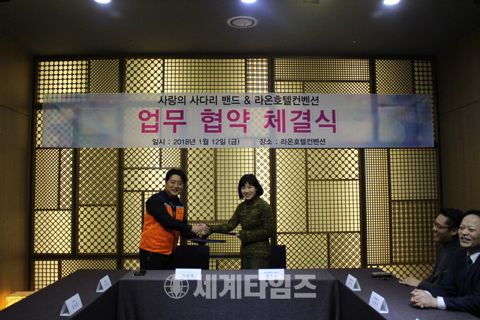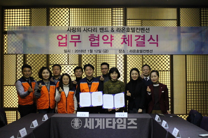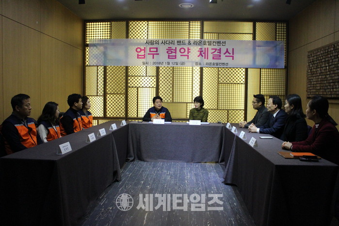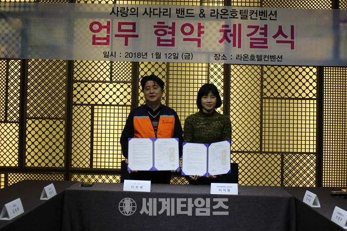 [대전=세계타임즈 이장성 기자] 6천명 회원들이 활동하고 있는 SNS 봉사단체인 사랑의 사다리 밴드(리더 이정제)는 12일 유성구 봉명동에 위치한 라온 컨벤션호텔(대표 이지원)과 업무협약 체결식을 통해서 양 기관이 지역발전을 위해서 나눔봉사를 전개하기로 하였다.