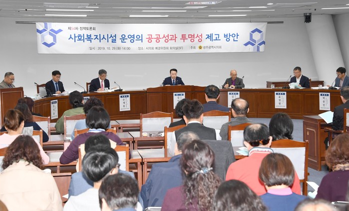 이날 토론회에는 광주광역시 사회복지협의회 김천수 회장, 노인복지협의회 손재홍 회장, 벧엘타운 김서윤 원장, 하남종합사회복지관 박종민 관장, 복지건강국 김일융 국장, 감사위원회 윤영렬 위원장이 토론자로 참여하였고 사회복지시설 종사자, 시민 등 100여명이 참석하였다.