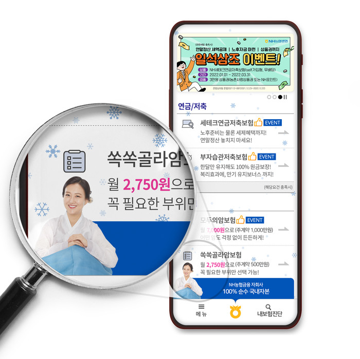 이번 리뉴얼을 통해 농협생명 온라인보험 모바일 메인화면에 날씨와 시즌에 맞게 눈, 비, 꽃잎 등이 내리는 배경화면이 자동 적용되는 기능을 추가했다. 현재 농협생명 온라인보험 사이트를 스마트폰으로 접속하면, 겨울 시즌에 맞게 눈이 내리고 있는 모습을 확인할 수 있다.