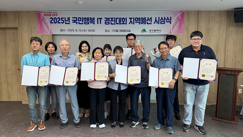 ▸ 수상자 9월 전국 본선 진출… 디지털 포용사회 실현에 앞장 [세계타임즈=대구 한윤석 기자] 대구광역시는 8월 13일(수) 오후 2시, 산격청사에서 지난 7월에 열린 ‘2025년 국민행복 IT 경진대회 지역예선’의 성적 우수자에 대한 시상식을 개최했다.