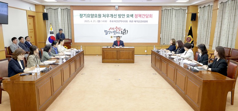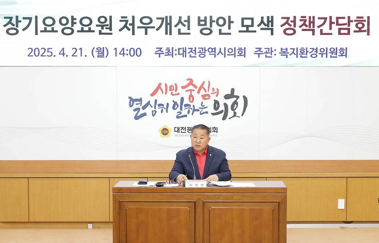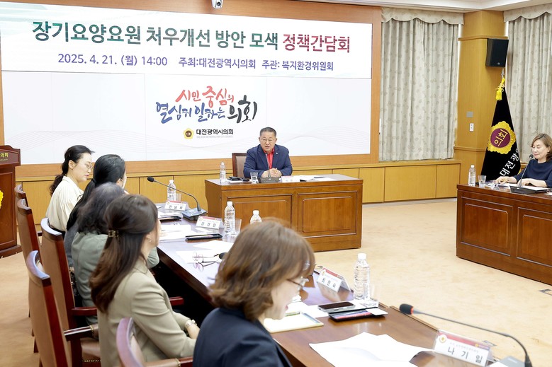 [대전 세계타임즈=이채봉 기자] 대전시의회 복지환경위원회가 21일 시의회 소통실에서 이한영 의원(국민의힘, 서구6)을 좌장으로 ‘장기요양요원 처우개선 방안 모색 정책간담회’를 개최하고 대전광역시 노인복지 서비스 수준을 높이기 위한 장기요양요원의 복지증진 및 지위향상 방안 마련에 나섰다.
