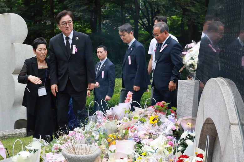 삼풍백화점 붕괴 참사 30주기인 29일 우원식 국회의장이 분향하기 위해 서울 서초구 매헌시민의숲 삼풍참사위령탑으로 향하고 있다. 2025.6.29