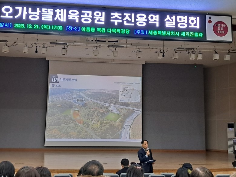 사업부서인 체육진흥과는 세종시 및 읍면동 체육회, 교육청 및 학교 관계자, 주민들로 ‘오가낭뜰 체육공원 추진 협의체’를 구성했고, 협의체는 3차례의 용역 보고를 받는 등 활발한 활동을 이어왔다.