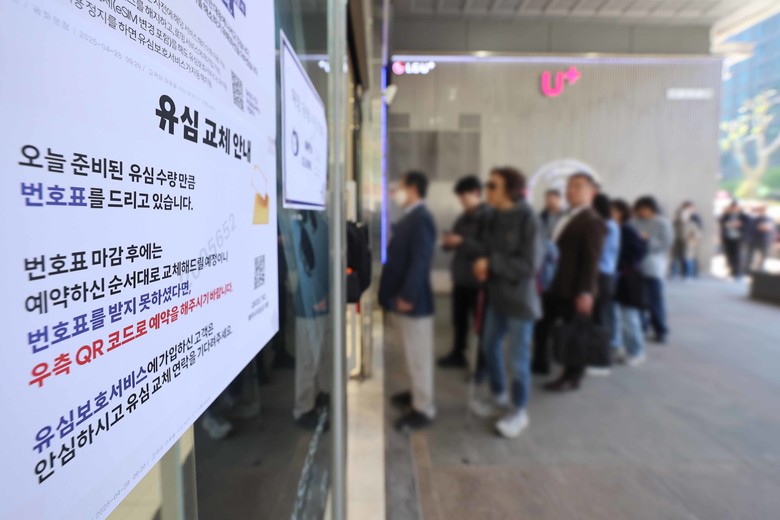 가입자 유심(USIM) 정보를 탈취당한 SK텔레콤이 유심 무료교체 서비스를 시작한 28일 서울 시내 한 SKT 대리점에 유심 교체 관련 안내문이 붙어있다. 2025.4.28