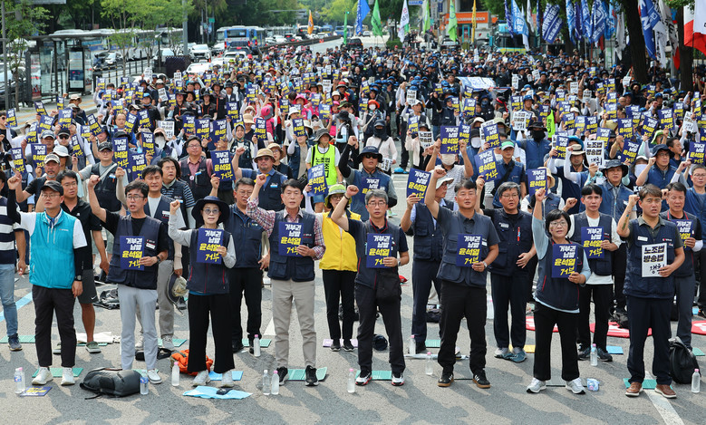 [세계타임즈 = 이장성 기자] 17일 오후 서울 광화문역 인근에서 열린노조법·방송법 쟁취! 8.17 거부권 거부 범국민 대회에서 참가자들이 구호를 외치고 있다. 2024.8.17