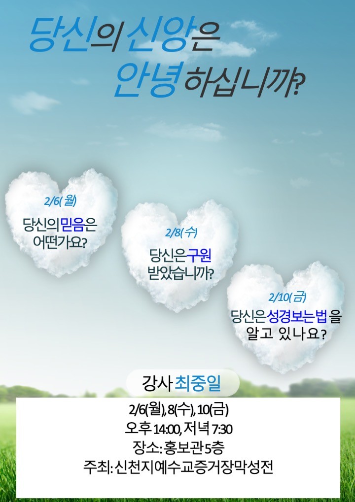 세미나는 6일(월) ‘당신의 믿음은 어떤가요?’, 8일(수) ‘당신은 구원받았습니까?’, 10일(금) ‘당신은 성경보는 법을 알고 있나요?’ 등의 주제로 진행해 궁극적인 신앙의 본질을 찾아가는 계기를 마련한다.