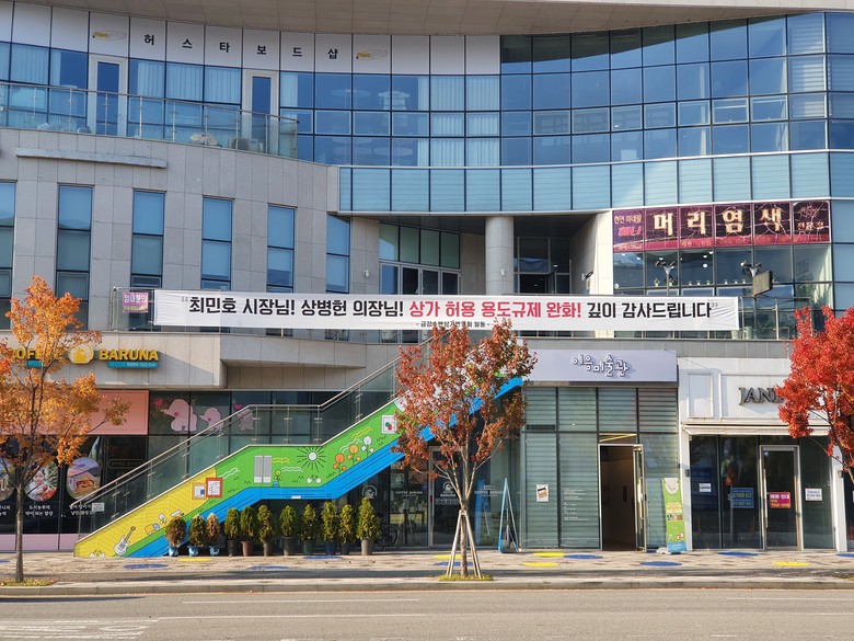 [세종 세계타임즈=이채봉 기자] 27일 세종시청사 동문 주자창 앞 금강수변상가에 행복도시 해제지역 상가 허용 용도 규제 완화에 대한 감사의 뜻을 전하는 금강수변상가번영회의 현수막이 걸려 있다.