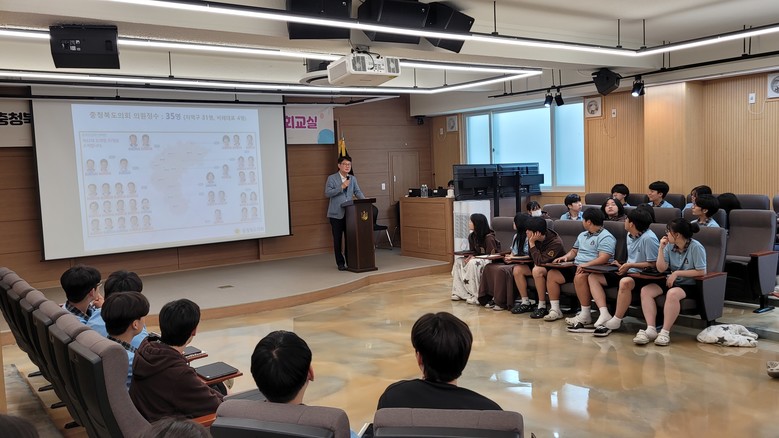 [충북 세계타임즈=이현진 기자] 충북도의회(의장 이양섭)는 30일 충주에 위치한 중산고등학교를 방문해 ‘찾아가는 의회교실’을 진행했다.