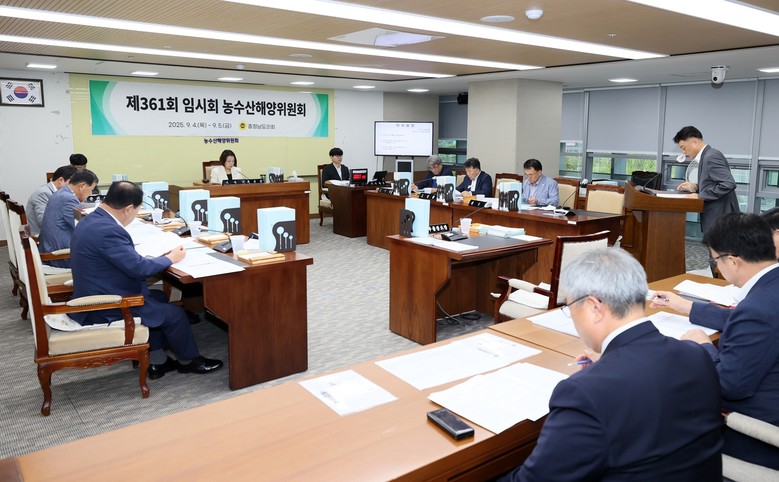 [충남 세계타임즈=이현진 기자] 충남도의회 농수산해양위원회(위원장 이연희)는 4일 제361회 임시회 제1차 회의에서 충남도 남부출장소‧농업기술원 소관 2025년 추가경정예산안과 남부출장소 2025년도 출연계획안을 심사했다.