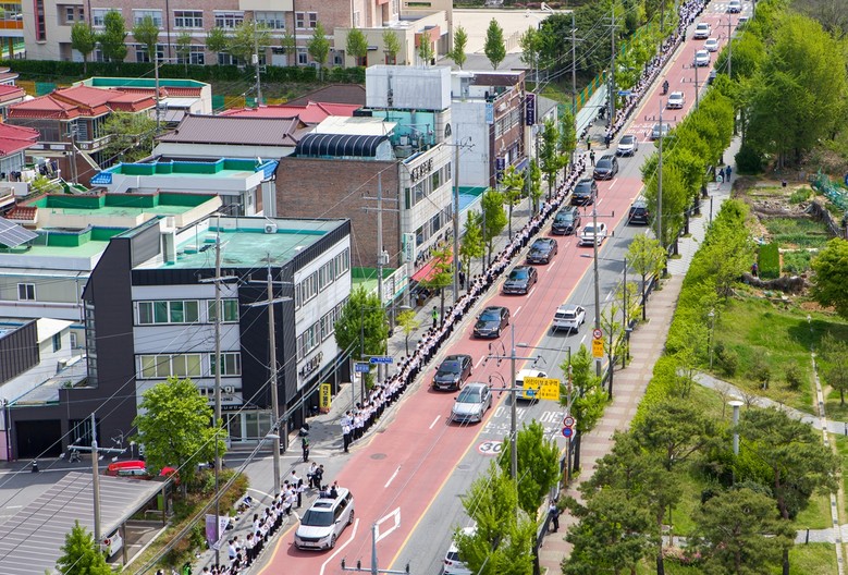 | ▲지난 4월 14일 이만희 총회장이 광주 베드로지파 본부성전에 방문하자 이를 마중을 나온 환영도열의 모습. [사진 제공 = 신천지예수교회] |