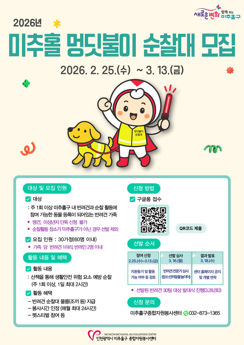 센터 관계자는 “멍딧불이 순찰대는 반려견과 함께하는 일상 속 산책이 곧 지역을 지키는 자원봉사 활동으로 이어지는 의미 있는 사업”이라며 “많은 반려 가족이 참여해 안전하고 따뜻한 미추홀구를 함께 만들어가길 바란다.”고 전했다.