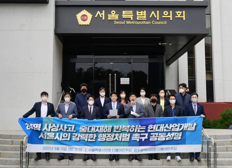 서울특별시의회와 광주광역시의회 더불어민주당 의원 일동은 13일 오후 1시 30분 서울특별시의회 본관 앞에서 발표한 공동성명서를 통해 ‘불법 부실 공사로 소중한 국민의 생명을 앗아간 현대산업개발에 대해서 등록말소처분 등의 강력한 행정조치를 내려 줄 것’을 서울시에 촉구했다.