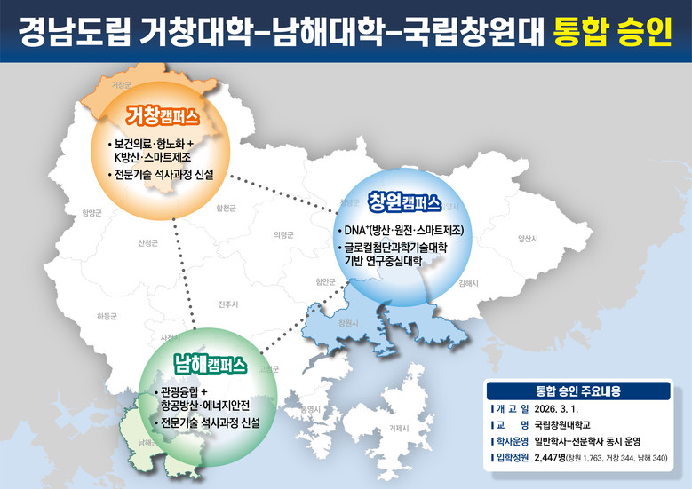 박완수 경상남도지사는 “오늘 교육부의 최종 승인으로 도립 거창대학과 남해대학, 국립 창원대학이 하나의 대학으로 통합되면서, 입학 정원 감축 없이 전문학사와 일반학사 과정을 동시에 운영하는 전국 최초의 사례가 됐다”고 밝혔다. 이어 “국립대 전환으로 대학의 브랜드 가치와 재정 안정성이 높아지고, 3개 대학의 인프라를 공동 활용함으로써 교육의 질과 경쟁력도 크게 향상될 것”이라며 “통합 대학이 지역과 함께 성장할 수 있도록 도 차원의 지원을 아끼지 않겠다”고 말했다.