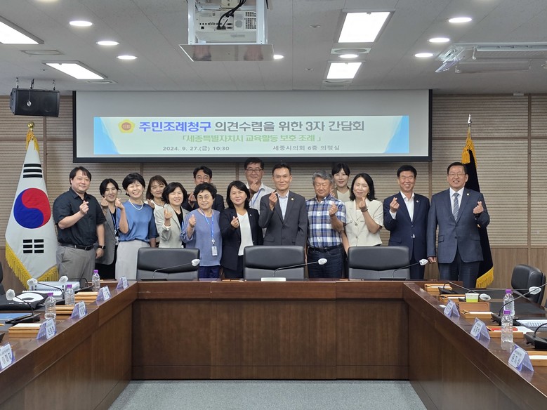 [세종 세계타임즈=이채봉 기자] 세종특별자치시의회(의장 임채성) 교육안전위원회(위원장 윤지성)는 주민조례 제정 청구를 통해 발의된 「세종특별자치시 교육활동 보호 조례」의 의견수렴을 위해 청구인, 관계 기관과의 3자 간담회를 27일 실시했다.