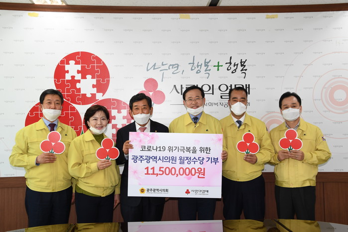 광주시의회는 31일, 시의회 소속 23명 의원 전원이 월정수당의 25%를 자발적으로 모금하여 이 중 1,150만원은 광주사회복지공동모금회에 성금으로 기탁하고, 나머지 일부는 코로나19로 어려움을 겪고 있는 대구시민을 응원하기 위해 마스크 5천장을 구매하여 대구시의회에 전달했다고 밝혔다.