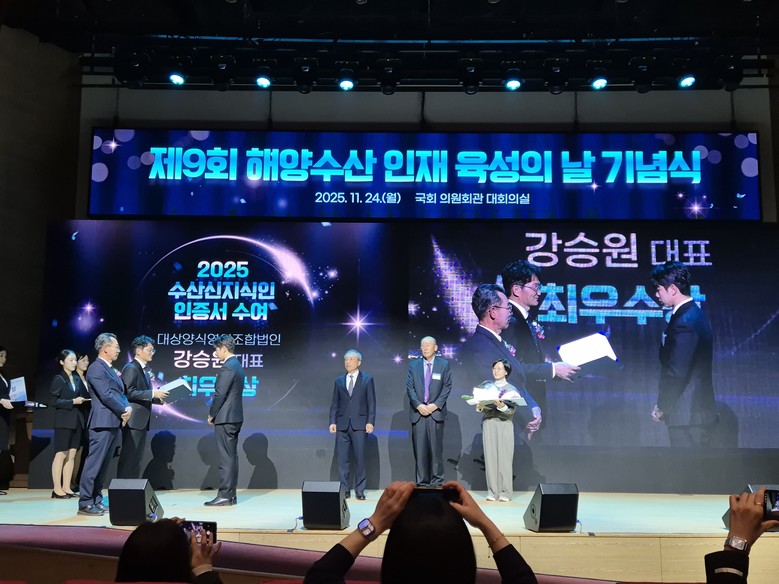강 대표는 전국 흰다리새우 종자의 30% 이상을 생산해 양식어가 소득 증대 및 수산업 경쟁력 향상에 공헌해 2위를 기록, 최우수상을 받았다.