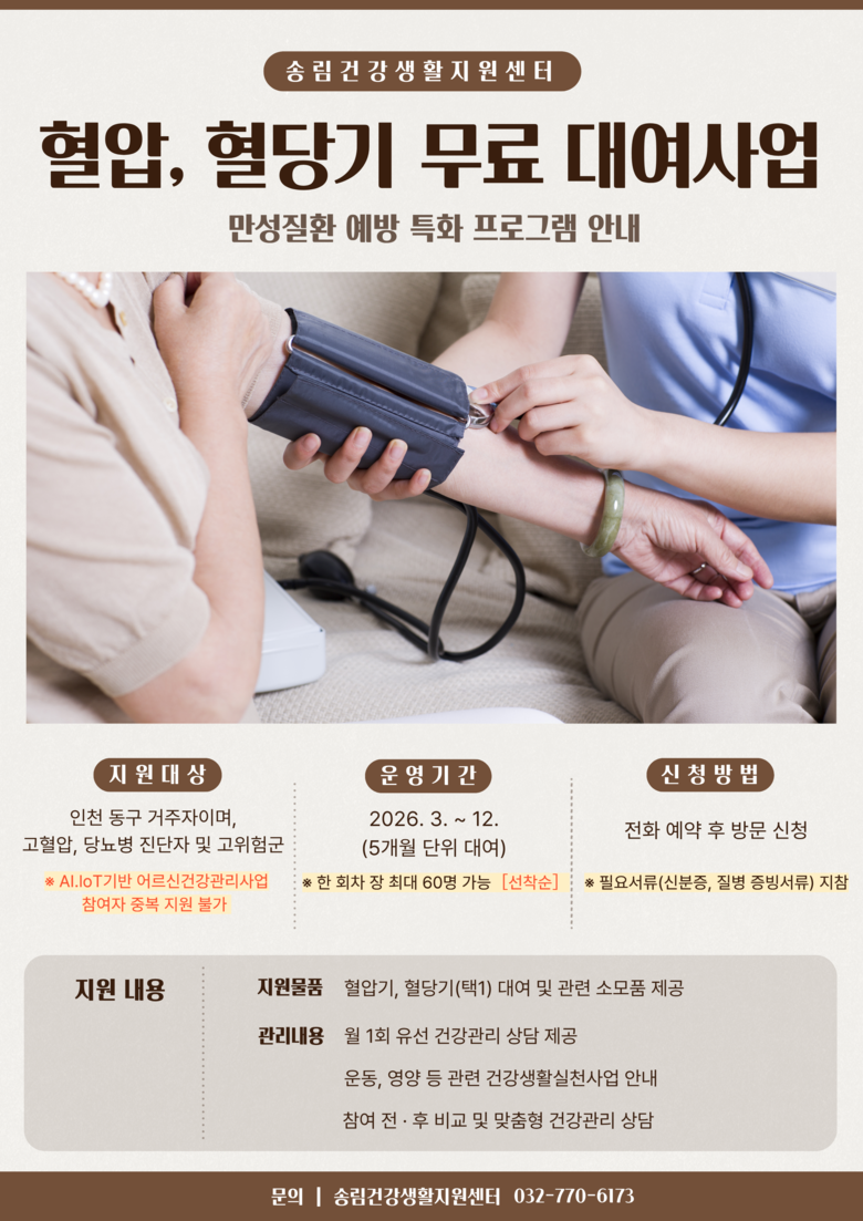 대상자는 혈압기 또는 혈당기 중 하나를 선택해 5개월간 대여할 수 있으며, 혈당 측정 소모품도 함께 제공된다. 이와 함께 건강관리 상담은 물론, 운동·영양 등 건강생활실천사업과 연계한 맞춤형 건강관리 정보도 지원받을 수 있다.
